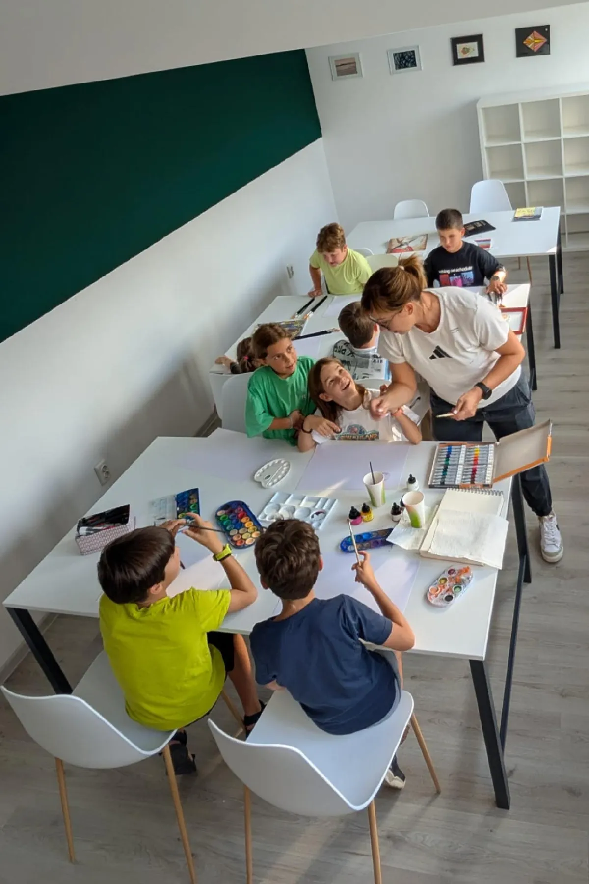 A gyerekek egy előre kidolgozott ütemterv szerint haladnak, amely lépésről lépésre vezeti be őket a művészeti alapokba, miközben fokozatosan elsajátítják az eszközök széles körű használatát, a különböző festékeket, alapvető színtan ismereteket, anyagokat és technikákat.